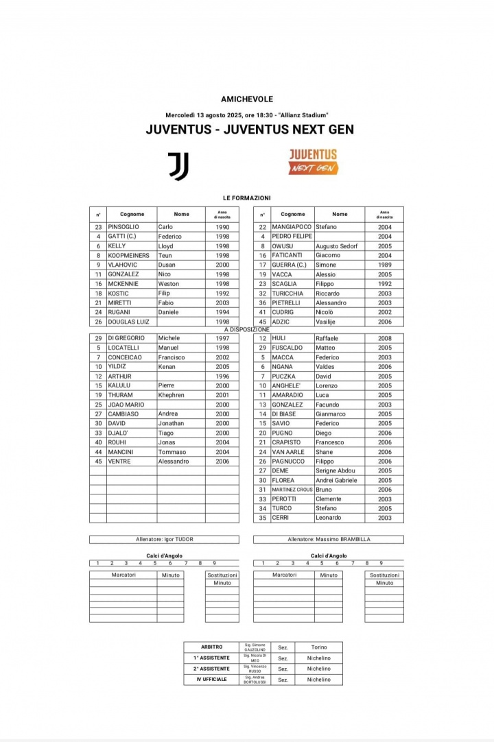 尤文新一代首发:22-曼吉亚波科、4-佩德罗-费利佩、8-奥乌苏、16-法蒂坎蒂、17-格拉、19-瓦卡、23-斯卡利亚、32-图里奇亚、36-皮特雷利、41-库德里格、45-阿季奇